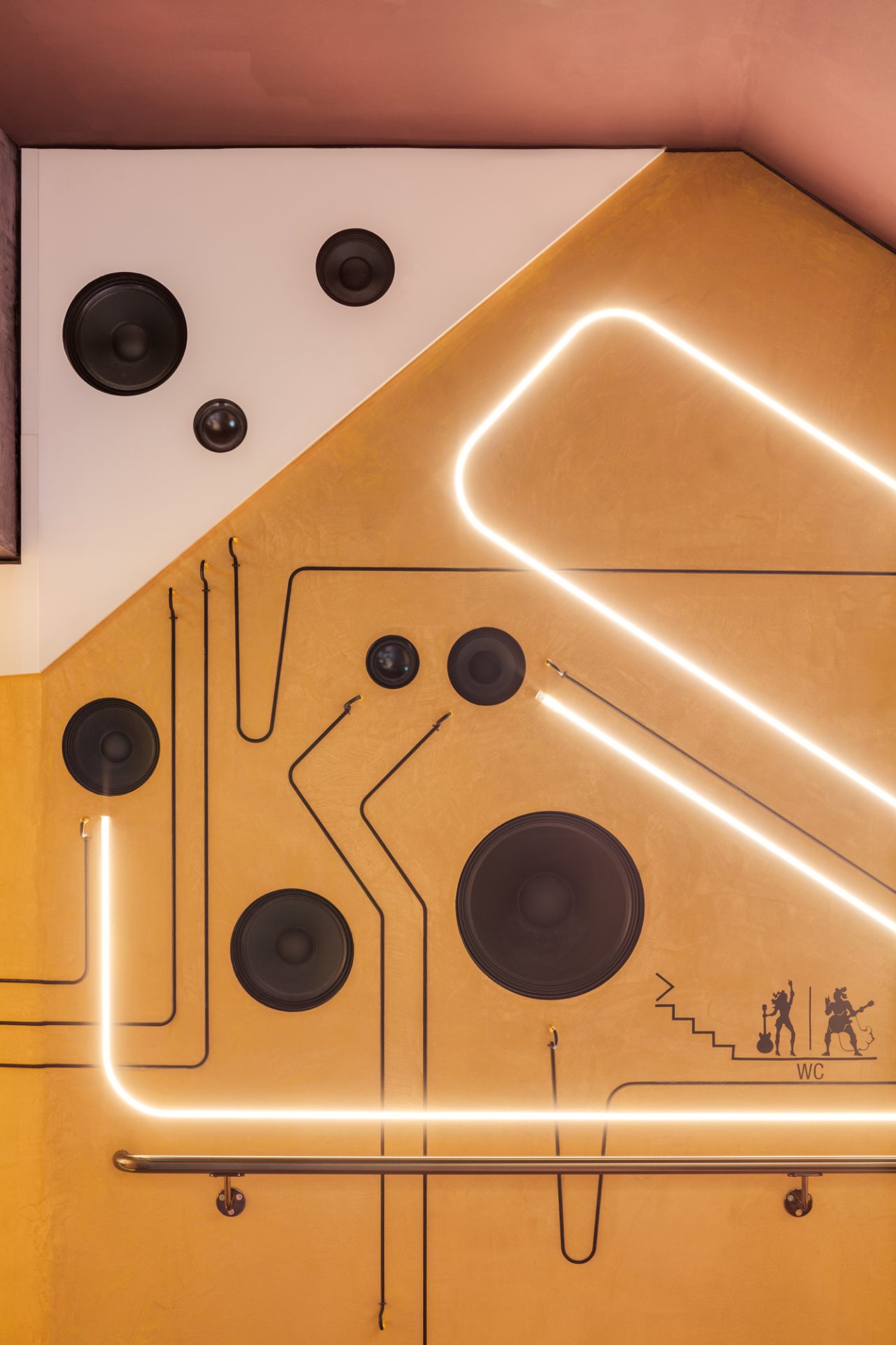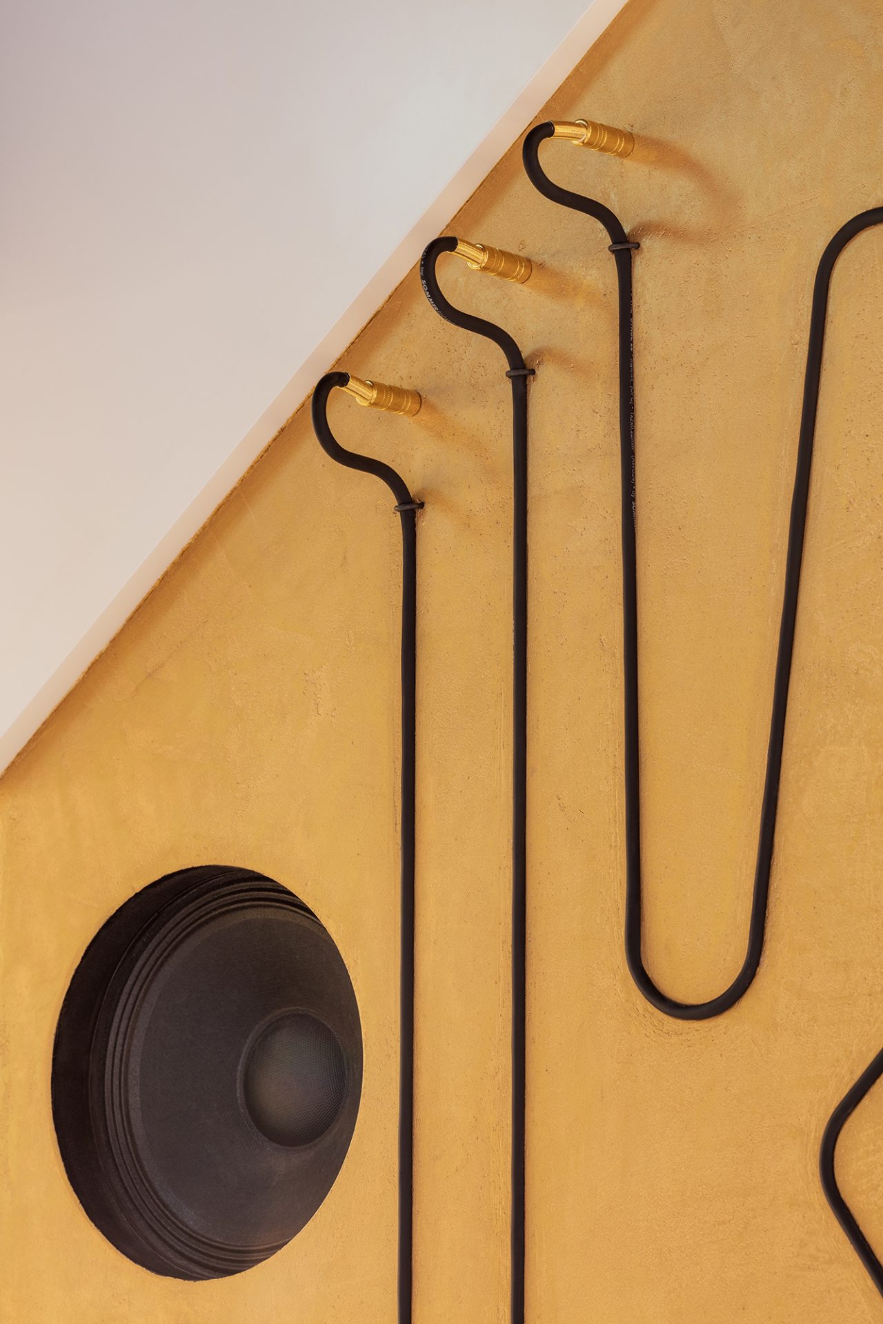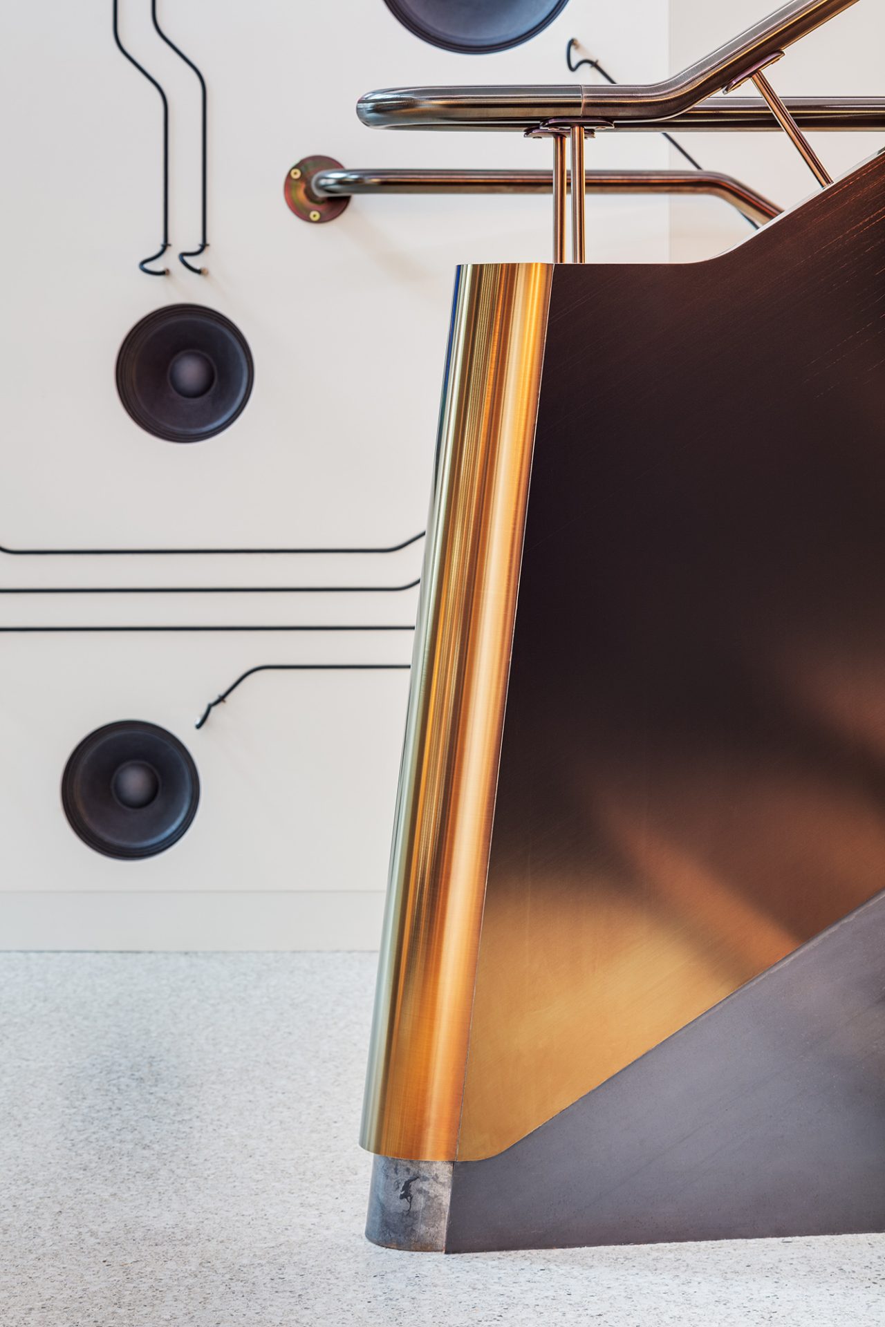 Die goldenen Messingflächen werden als Vermittler, Wegweiser und verbindendes Element eingesetzt. Sie kennzeichnen Raumübergriffe und fungieren als Hintergrund für Waren und Exponate.